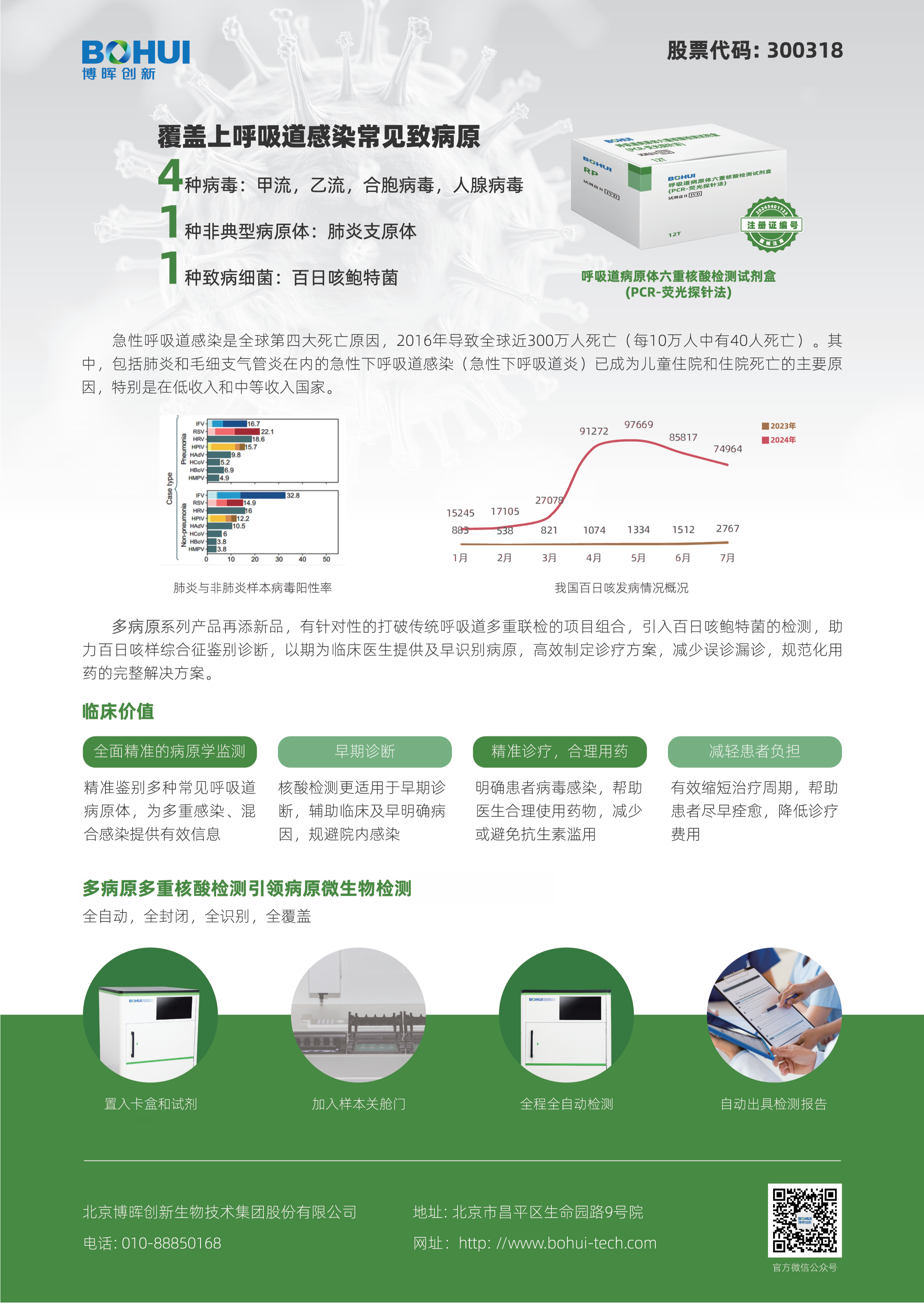 面對潛在的跨境傳播風險,早期精準檢測是防控的關鍵環(huán)節(jié)。博暉創(chuàng)新深耕分子診斷領域,推出的呼吸道病原體六重核酸檢測試劑盒(國械注準 20243401723)可檢測甲型流感病毒、乙型流感病毒、呼吸道合胞病 毒、腺病毒、肺炎支原體、百日咳鮑特菌,這也是目前包含百日咳多聯(lián)檢獨家解決方案,為百日咳及常見呼吸道病原體檢測提供了高效工具。該系列試劑盒采用全封閉泵液模塊結合熒光定量 PCR 技術,可實現(xiàn)全自動一體化檢測,操作簡便且結果精準,能快速區(qū)分百日咳鮑特菌與其他呼吸道病原體,助力臨床早期診斷、及時干預。